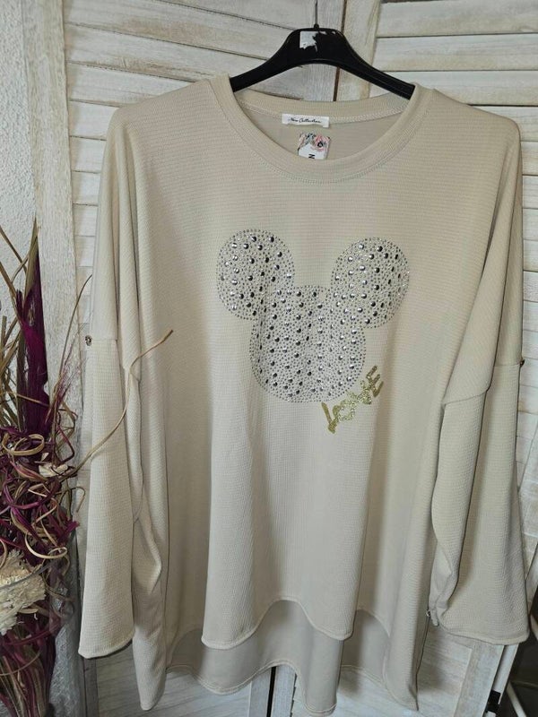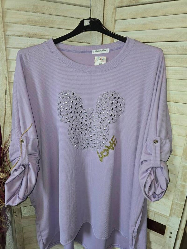 Leichtes langarm Shirt mit Maus aus Strasssteine ärmel zum hochkrempeln und knöpfen